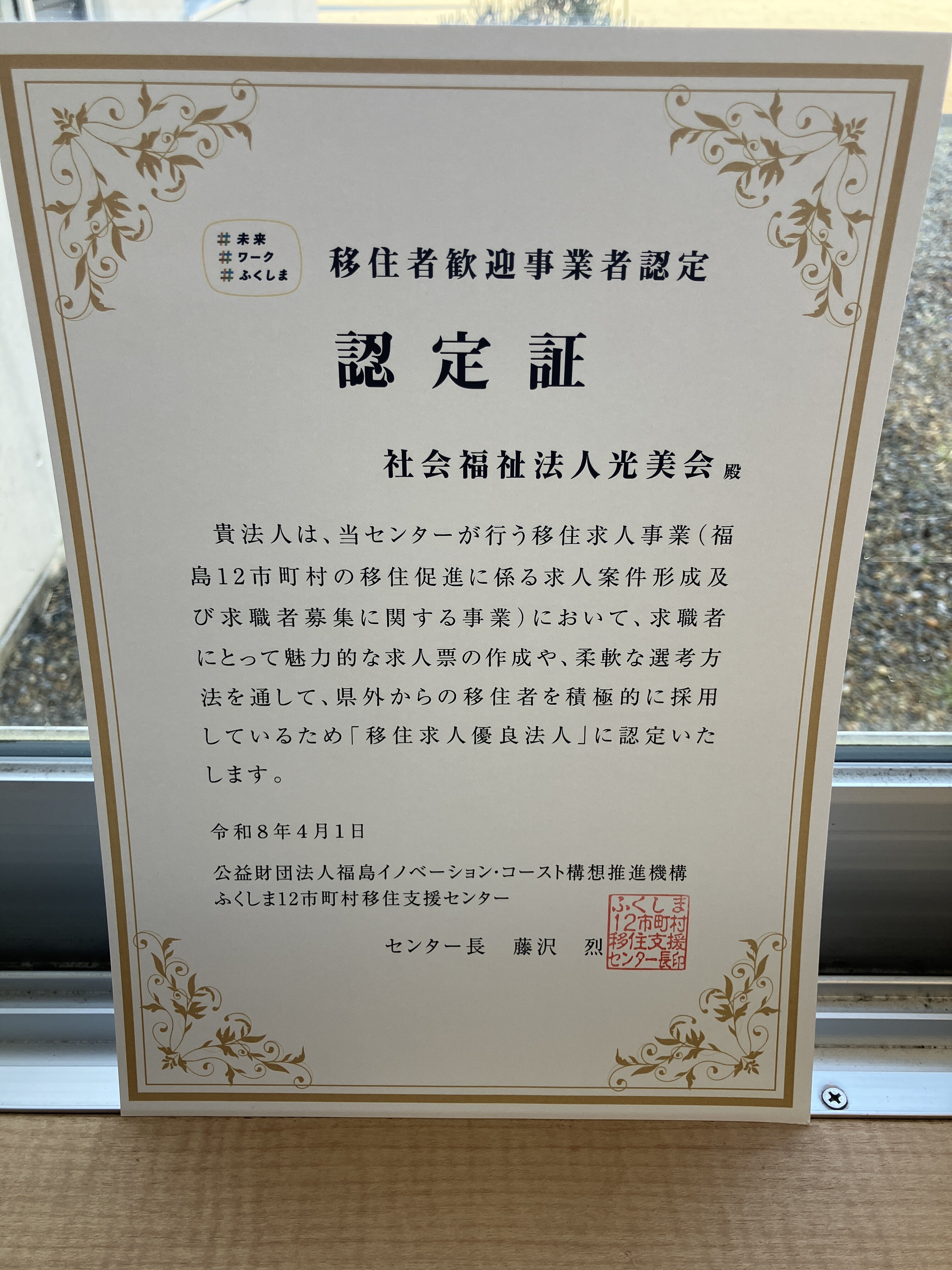 光美会ではこの度、公益財団法人福島県イノベーションコースト構想推進機構 ふくしま12市町村移住推進センターから、移住歓迎事業者認定の認定証をいただきました。